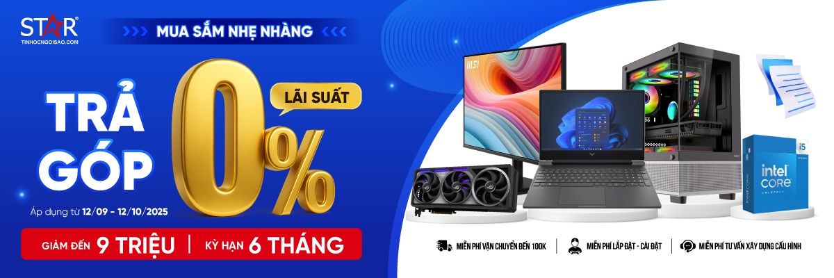 - Chủ động tài chính: Chương trình trả góp kỳ hạn từ 3 - 12 tháng giúp bạn dễ dàng phân bổ chi tiêu mà vẫn có thể sở hữu sản phẩm mong muốn. (Kỳ hạn trên 6 tháng Tin Học Ngôi Sao hỗ trợ 50% lãi suất)