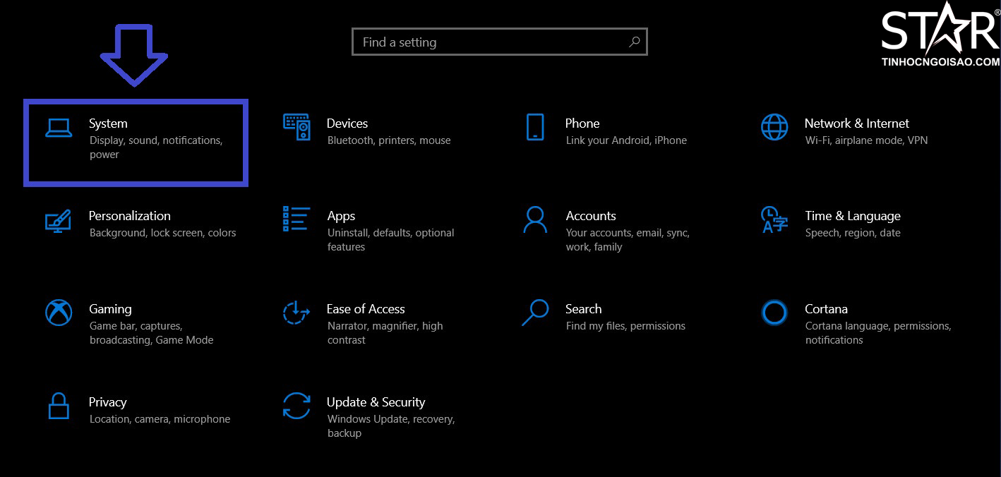 Bước 1: Sử dụng tổ hợp phím Windows + I mở Settings rồi chọn System.
