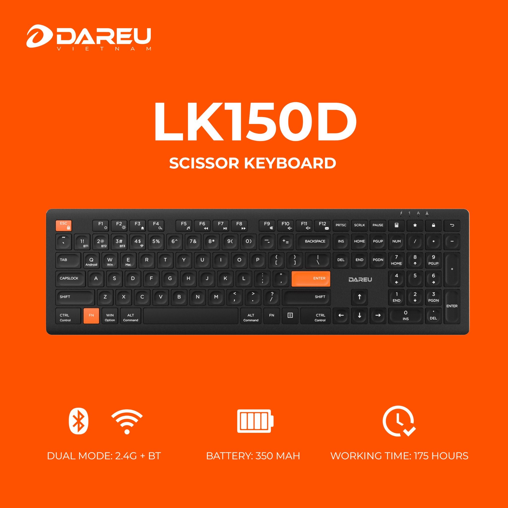 Bàn Phím Không Dây Dare-U LK150D Black Orange (Dual Mode, Scissor Switch)