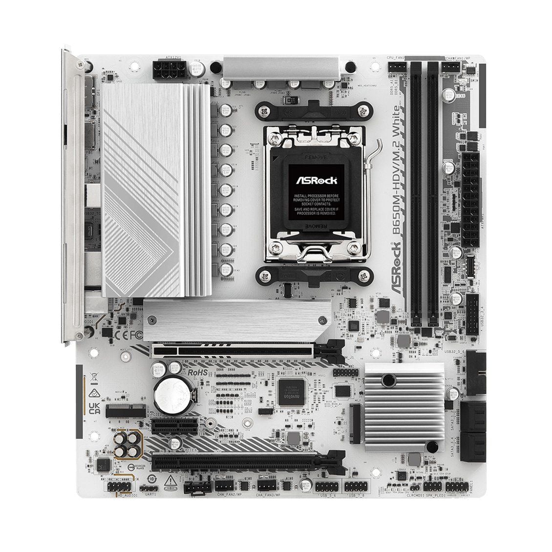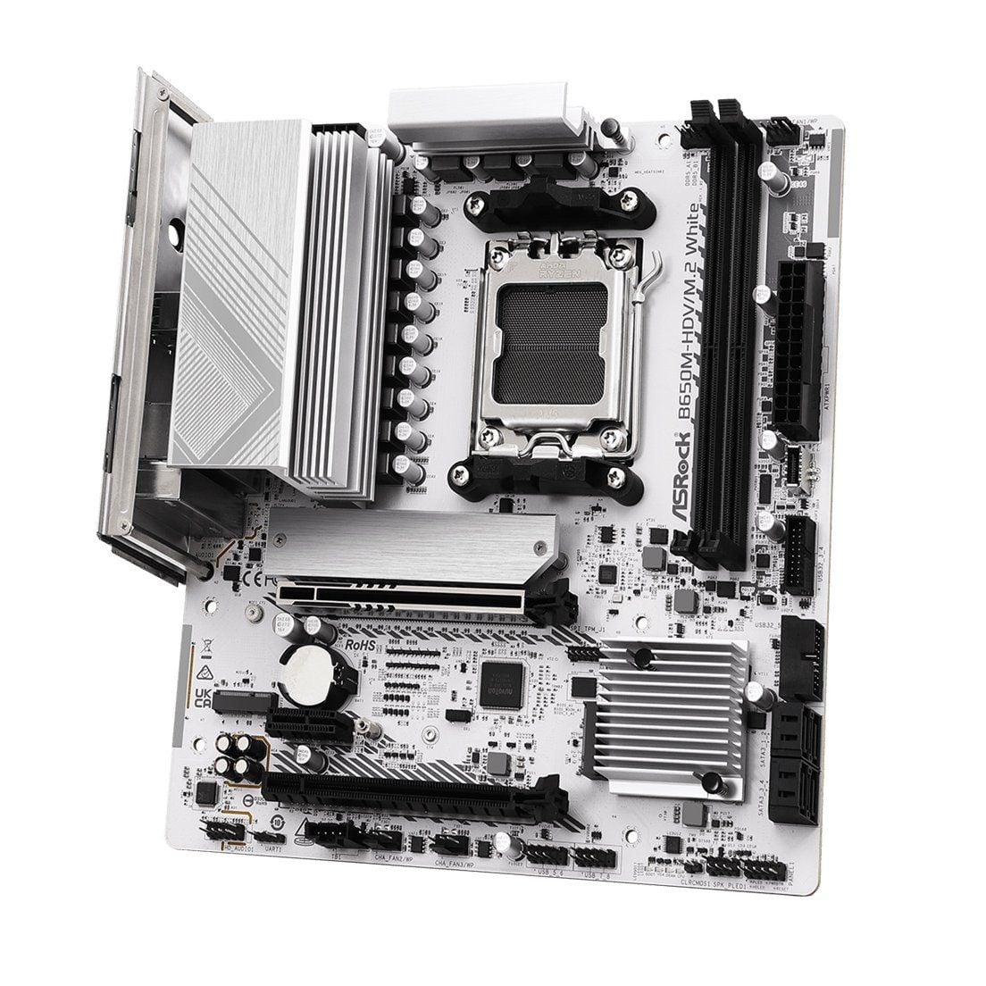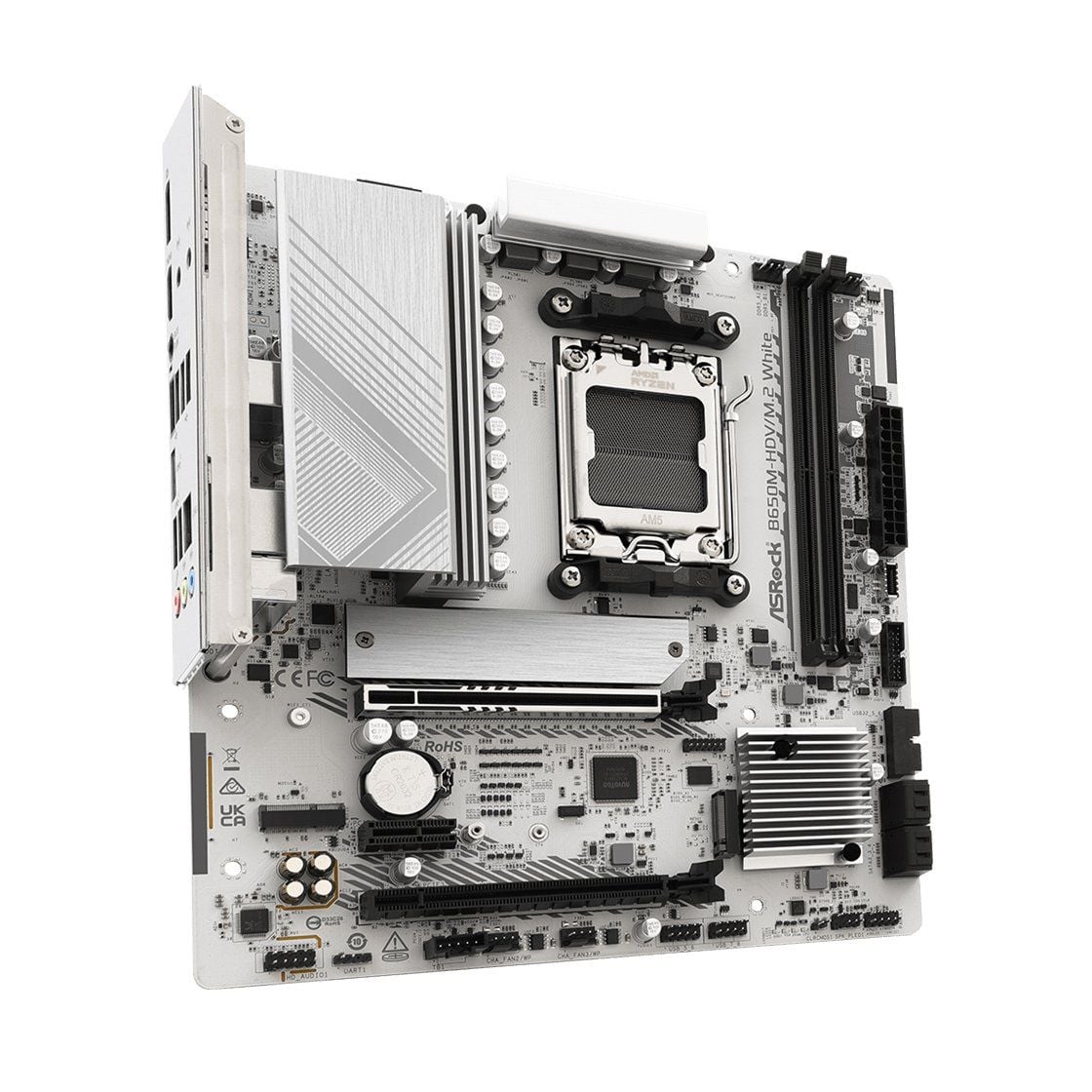 Phiên bản Asrock B650M-HDV/M2 Trắng mang đến vẻ ngoài tinh tế, hiện đại, phù hợp với các bộ máy tông trắng hoặc RGB. Sắc trắng của PCB kết hợp cùng chi tiết bạc tạo cảm giác cao cấp, dễ phối hợp với các linh kiện cùng tông màu. Với form Micro-ATX nhỏ gọn, bo mạch này vừa tiết kiệm không gian, vừa giữ được đầy đủ tính năng của một hệ thống cao cấp, phù hợp cho cả case mid tower và mini tower.