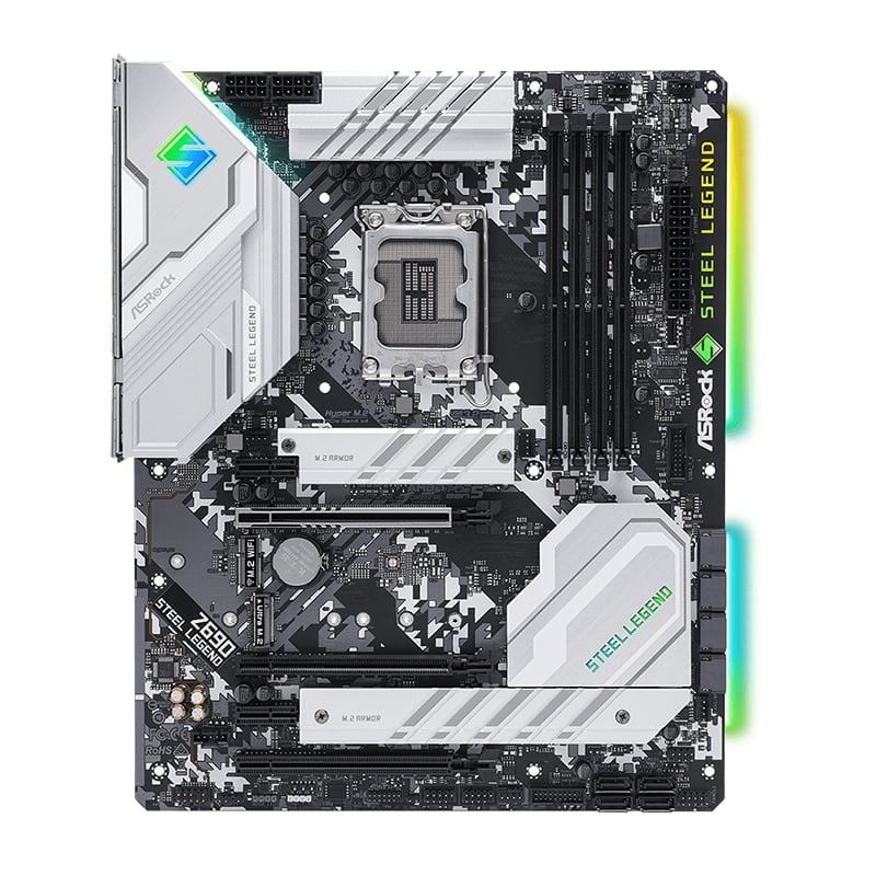 Asrock Z690 Steel Legend gây ấn tượng mạnh với thiết kế pha trộn giữa trắng, bạc và đen, mang phong cách hiện đại, mạnh mẽ nhưng vẫn tinh tế. Bo mạch chủ được trang bị đèn RGB tích hợp và đầu cắm RGB có thể định địa chỉ, cho phép người dùng tùy chỉnh hiệu ứng ánh sáng theo sở thích.