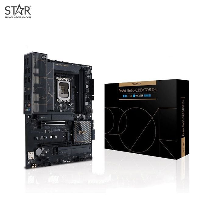 Bo mạch chủ  ASUS ProArt B660-Creator D4 được thiết kế để đáp ứng hiệu suất cao cho các công việc có nhu cầu sáng tạo nội dung chuyên sâu như render hình ảnh 3D và chỉnh sửa video 4K/8K. ProArt B660 giúp giải phóng hiệu suất của bộ vi xử lý Intel thế hệ thứ 12 thông qua thiết kế phân phối điện và làm mát mạnh mẽ. Đồng thời, nó còn có khả năng kết nối toàn diện bao gồm Ethernet 2,5 Gb và 1 Gb tích hợp, đầu nối mặt trước USB 3.2 Thế hệ 2×2 Type-C với Quick Charge 4 + và DisplayPort qua USB-C.