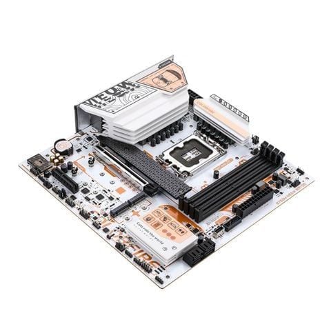 Điểm đặc biệt của Colorfire B760M-MEOW DDR5 ORANGE nằm ở bộ giáp làm mát bằng sương giá tùy chỉnh, bao phủ toàn bộ khu vực VRM và chipset. Thiết kế này giúp tản nhiệt nhanh, duy trì nhiệt độ lý tưởng, đảm bảo hệ thống vận hành ổn định trong mọi điều kiện.