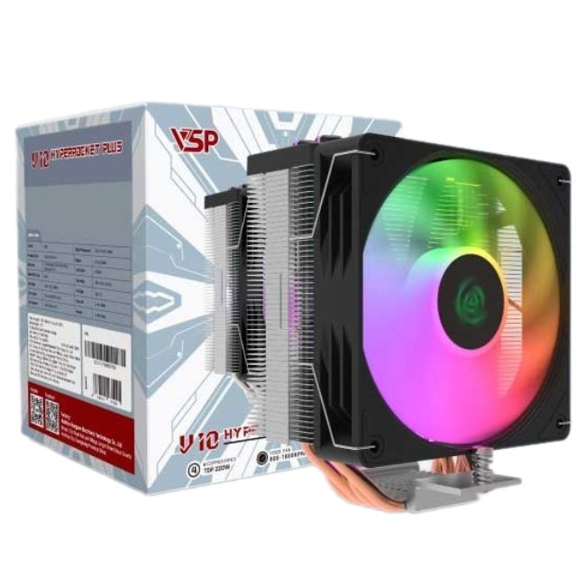 Tản nhiệt khí VSP V10 HyperRocket Plus – Đen là lựa chọn rất đáng cân nhắc trong phân khúc tản nhiệt khí hiệu năng cao. Sản phẩm nổi bật với TDP 220W, 4 ống đồng Direct Heat Pipes, quạt 120mm PWM mạnh mẽ, LED ARGB hiện đại và khả năng tương thích socket cực rộng.